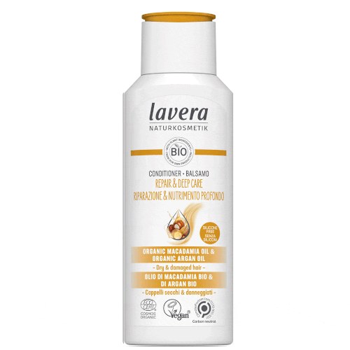 Discover the lavera secret of naturally effective hair care! The lavera Repair and Deep Care Conditioner has a carefully balanced natural composition with nourishing organic macadamia nut oil and organic argan oil . This natural and organic conditioner intensively nourishes and cares for your stressed and damaged hair from the roots to the tips and helps to effectively repair hair damage.